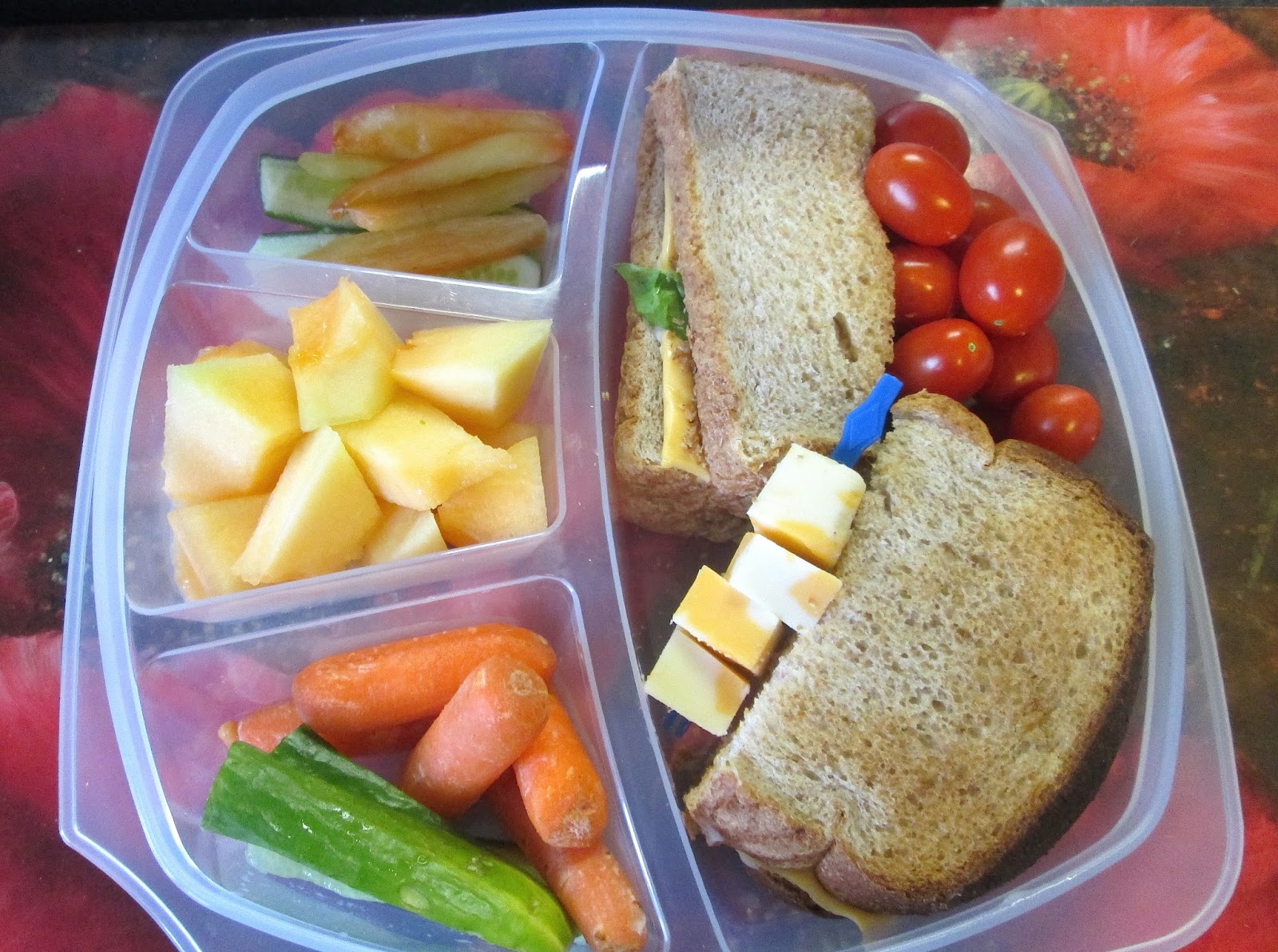 And this one has toasted whole wheat bread with turkey, ham, roast beef, lettuce, cheese (triple decker) with mayonnaise and cream cheese along with baby carrots, cucumbers, grape tomatoes, sweet peppers, marble cheese cubes and cantaloupe chunks.