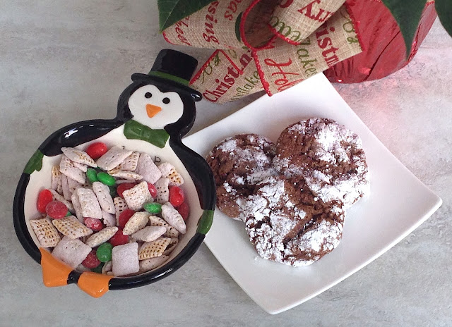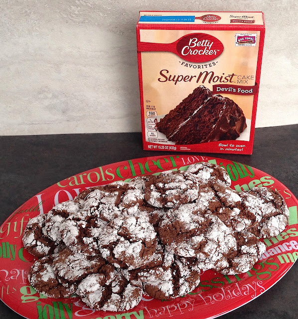 Now once the Chex mix was done, I needed cookies. Cookies, of course, are an integral part of the holiday baking season, so I decided to make a quick batch of crinkle cookies. Again, Winco didn't fail me and I picked up Betty Crocker Devil's Food Cake mix and whipped topping. I already had the basics like eggs and powdered sugar at home. Crinkle cookies are so easy to make, just 4 ingredients, with one being the cake mix and they look really pretty when they are done. They also are a nice, chewy, almost brownie like cookie, so they are perfect with a cup of tea. (If you don't want chocolate, swap out the Devil's Food Cake mix for Betty Crocker Super Moist Yellow Cake Mix.)