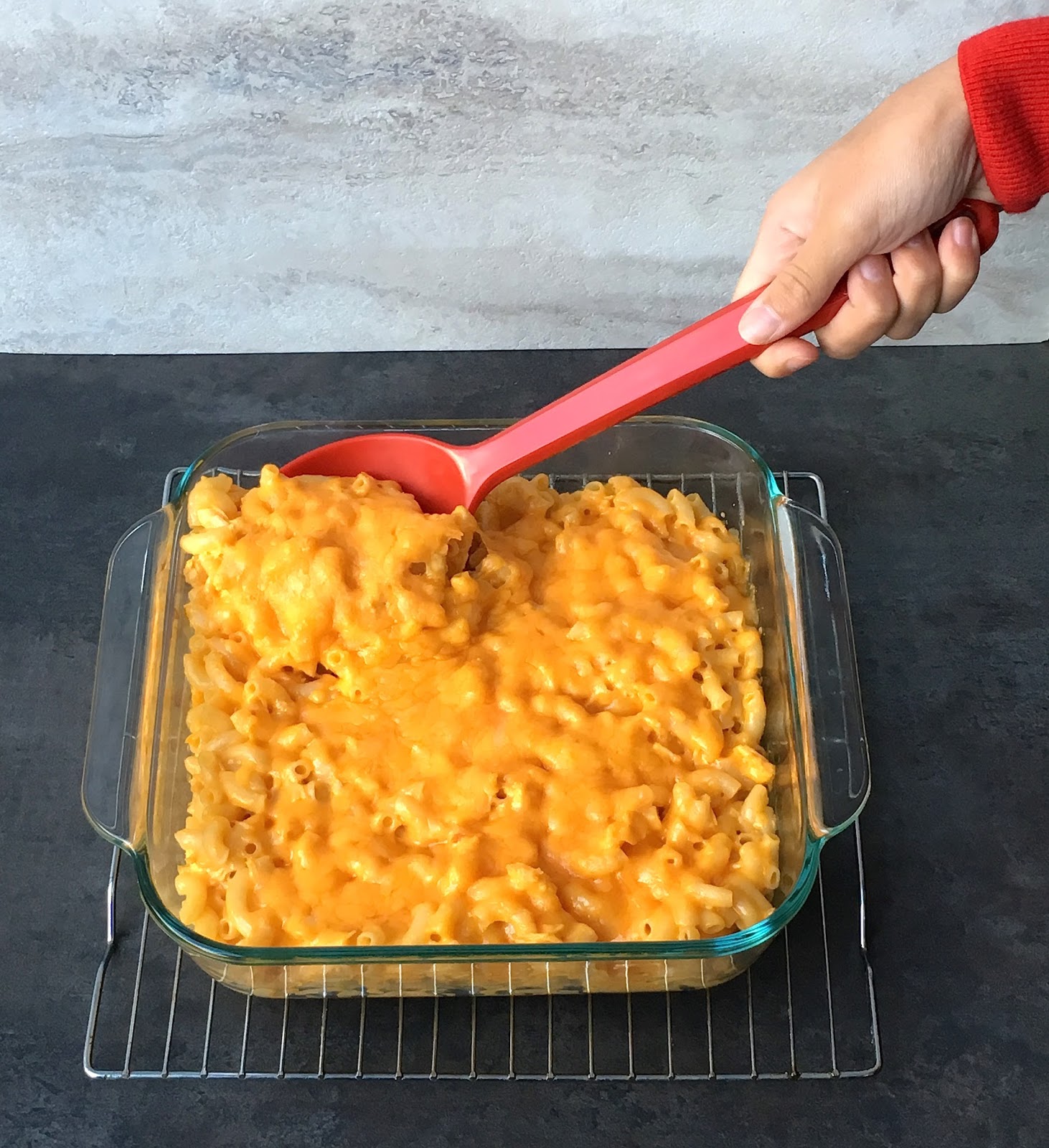 Spoon into a 1.5 quart casserole dish, coated with baking spray; top with shredded cheese.