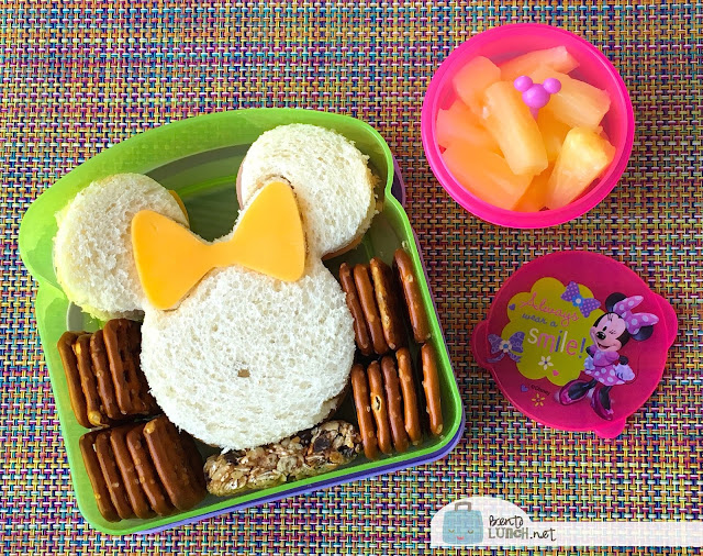 In this lunch, we have a ham and cheese Minnie Mouse sandwich, tucked into a sandwich box. The Minnie Mouse cutter, along with the little cups, were a Walmart find. I filled the extra area around the sandwich with some dry foods (pretzels and a little granola bar). I was low on fresh fruit, so I opted for some canned pineapple, drained, which went into one of the new Minnie Mouse cups since they matched. Not pictured, I added yogurt, a cheese stick, and some other snacks.