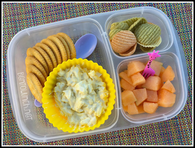 Both kids like different options to go with their egg salads, but in this one, we have simple crackers, probably because I had those opened already. I added fresh cantaloupe for a fruit, and Faith opted to take a few veggie chips with her. I believe she also grabbed a yogurt tube as well, since she stays longer at school on certain days. Lunch is packed in one of our Easy Lunchboxes.
