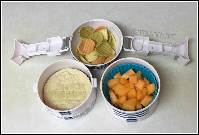 I used another section of the lower body to add cantaloupe, tucked inside a silicone cup for easier cleaning. The top dome held veggie chips so I could flip it over without worrying that something would leak. Not pictures, I set a couple of cookies on top of the sandwich and added a yogurt tube.