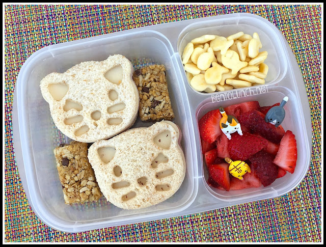 To the right, I sliced strawberries and Ben picked out some of our cat picks to decorate the fruit. He said since cats like fish, we should use parmesan Goldfish crackers, and I put some granola bars into the main compartment. I added a few snacks, just in case this wasn't enough food for all day long.