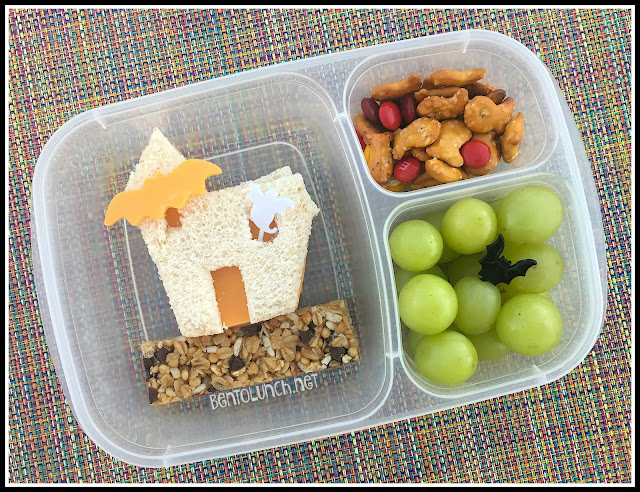 In this lunch, we made a haunted house ham and cheese sandwich on honey wheat bread. The haunted house cutter is only the outside shape, so I just used a knife to add the door and windows. A rather large bat (maybe the house is built on a radioactive swamp???) is cut from cheddar to decorate it and a ghost pick holds it all together. Under the house is a chocolate chip granola bar.